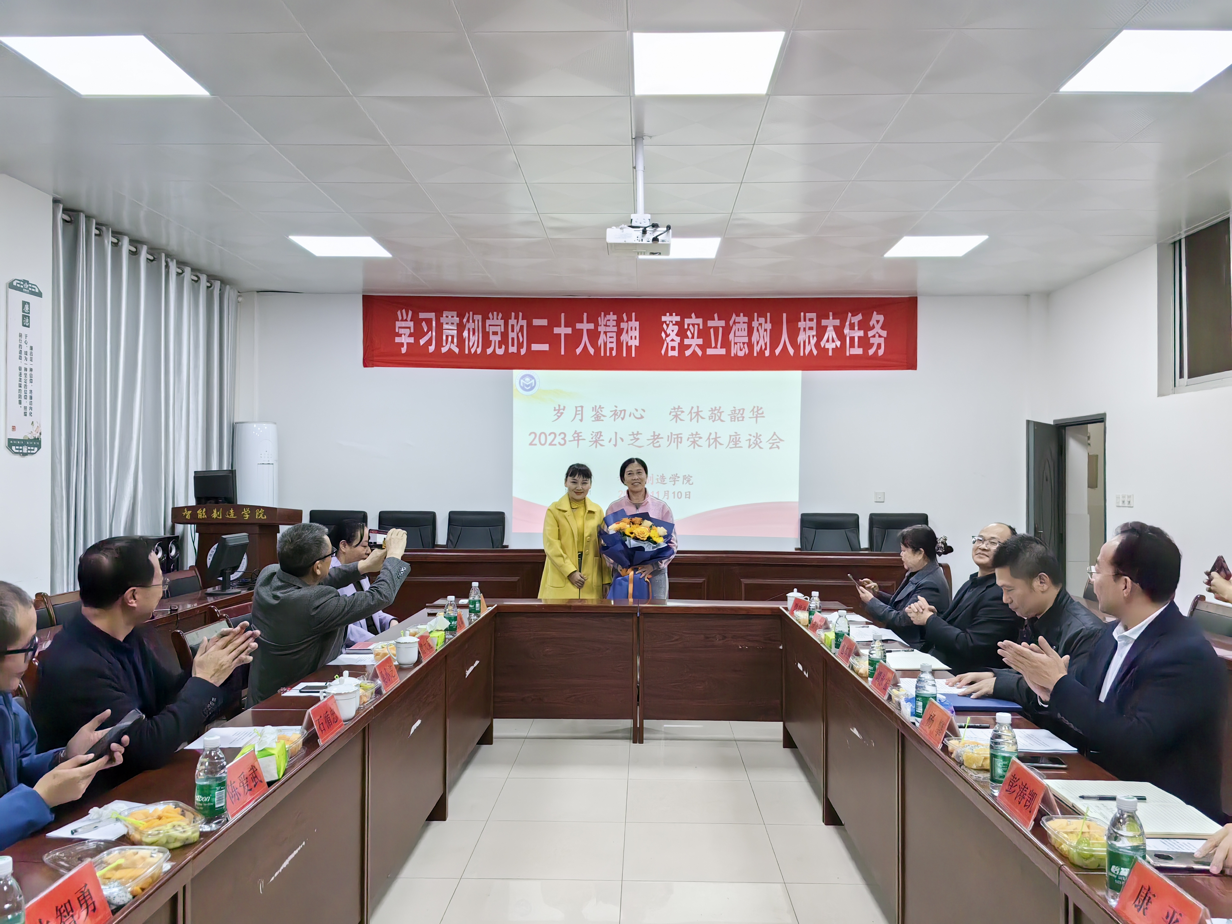 本网讯(通讯员 曾妙春)岁月鉴初心,荣休敬韶华。为弘扬尊师重教的优良传统,加强师德师风建设,增强教师的归属感、幸福感和荣誉感。11月10日下午,学院隆重举行梁小芝老师光荣退休座谈会。智能制造学院原院长魏大宽、工会原常务副主席石循忠、梁小芝老师、学院领导班子成员、系主任、教师代表、科级干部、分工会委员参加会议。会议由党总支书记杨攀主持。