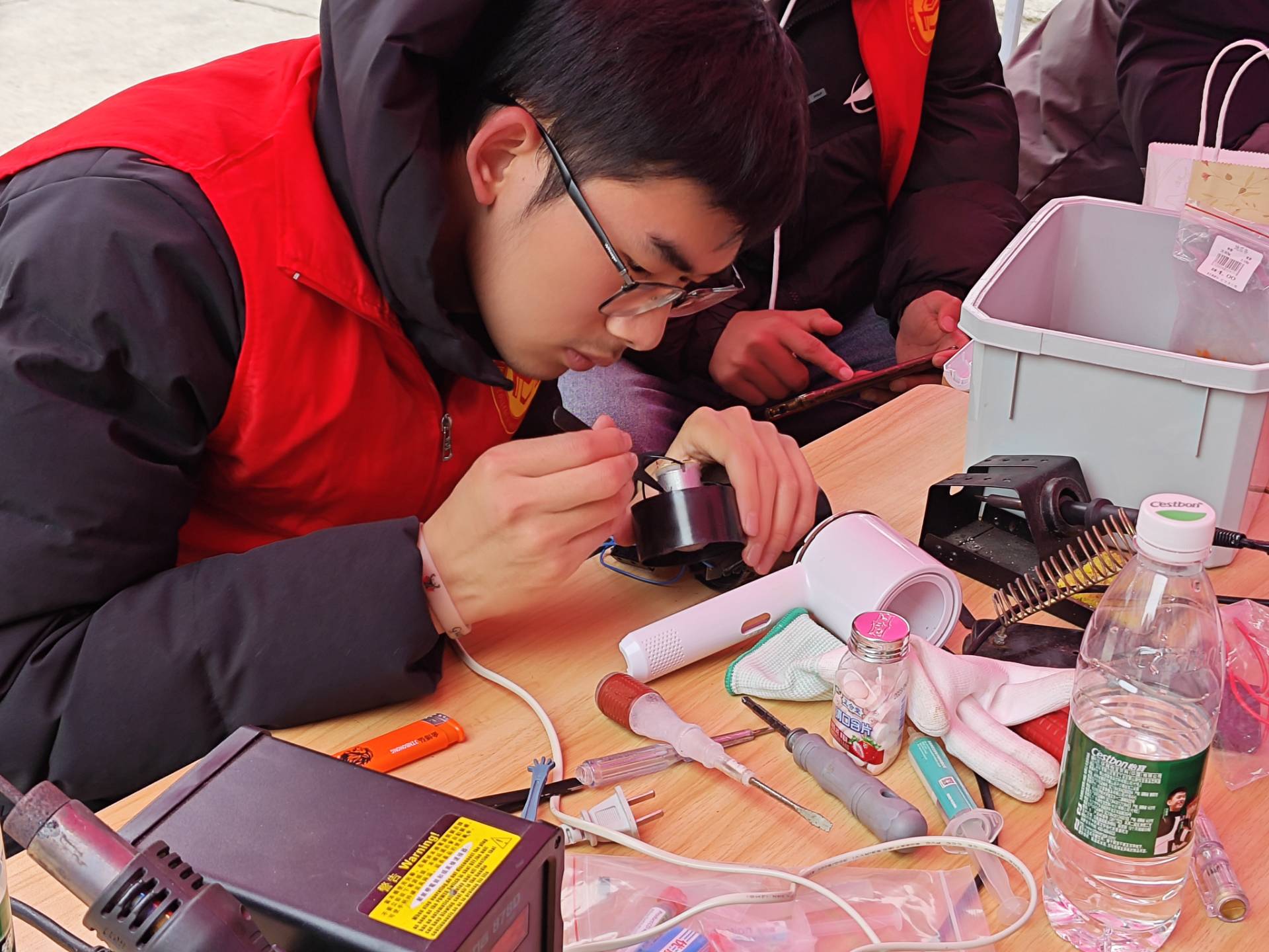 “同学,我的电脑好像坏掉了,你帮我看看。”“读卡器识别不到了,麻烦修修。”……刚摆好服务台,志愿者们便立即投入到紧张繁忙的维修工作中,前来维修的学生络绎不绝。