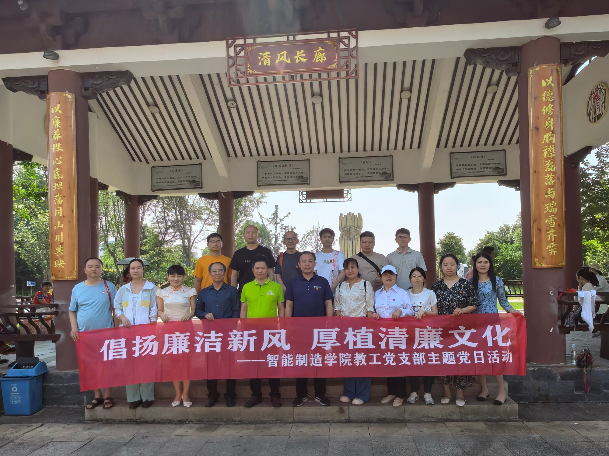 本网讯(通讯员 游珍珍)5月25日,学院组织教工党员赴东安县紫水廉洁文化主题公园开展“倡扬廉洁新风 厚植清廉文化”主题党日活动,让教工党员在耳濡目染中品味清风、正心修身,自觉接受廉洁文化熏陶。在讲解员的引导下,参加活动人员依次参观了“清风永继区”“鉴史问廉区”“正本清源区”“勤俭孝廉区”四个主题文化区。一条条掷地有声的廉洁警句,一个个肃然起敬的廉吏故事,一组组寓意深刻的廉洁漫画,给在场的教工党员上了一堂意义深刻的廉政教育课。