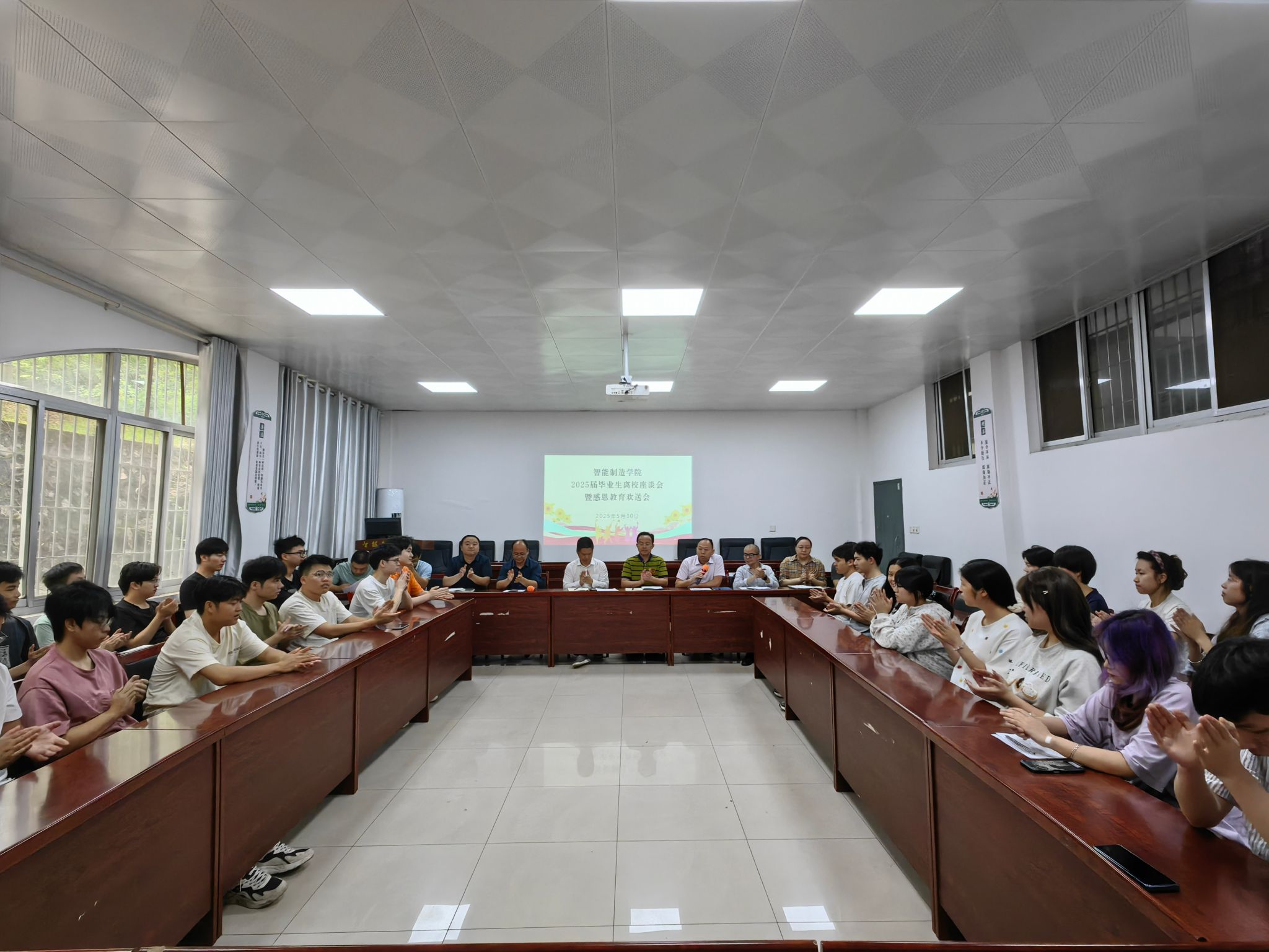 会上,毕业生代表踊跃发言,深情回顾了大学四年的成长与收获,回顾了与老师、同学共同度过的美好时光,深刻感恩学院搭建的广阔发展平台,由衷表达了对学院各位师长的谆谆教诲与无私奉献。与会教师代表也向即将离开校园的毕业生们表达深深的祝福。党总支书记杨攀对参会毕业生圆满完成大学四年学业、顺利毕业表示祝贺,希望毕业生树立正确的就业观创业观,遵纪守法,廉洁从业,坚守正道,行稳致远。院长谭永宏对2025届毕业生在校期间取得的成绩表示祝贺,鼓励他们要始终保持对专业知识的渴望和对生活的热爱,以智慧为刃,以创新为帆,勇担制造强国使命。
