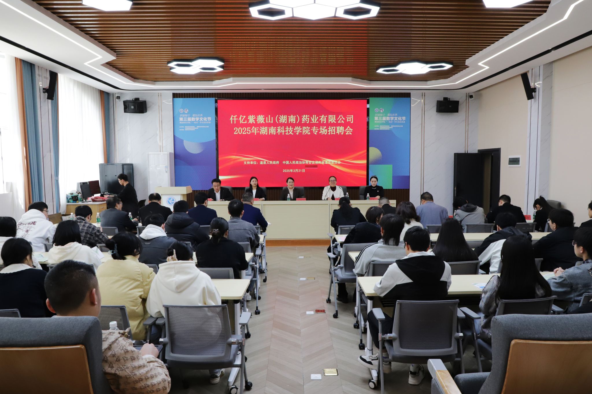 本网讯(通讯员 张亚南)3月21日,2025届毕业生道县高新区专场招聘会在世界杯官网举行。道县政协党组书记、主席刘忠华一行携省级高新技术企业仟亿紫薇山(湖南)药业有限公司代表团来校开展人才招聘。副校长郑银芳出席活动并致辞,招生就业与创新创业指导处处长胡清华主持活动。