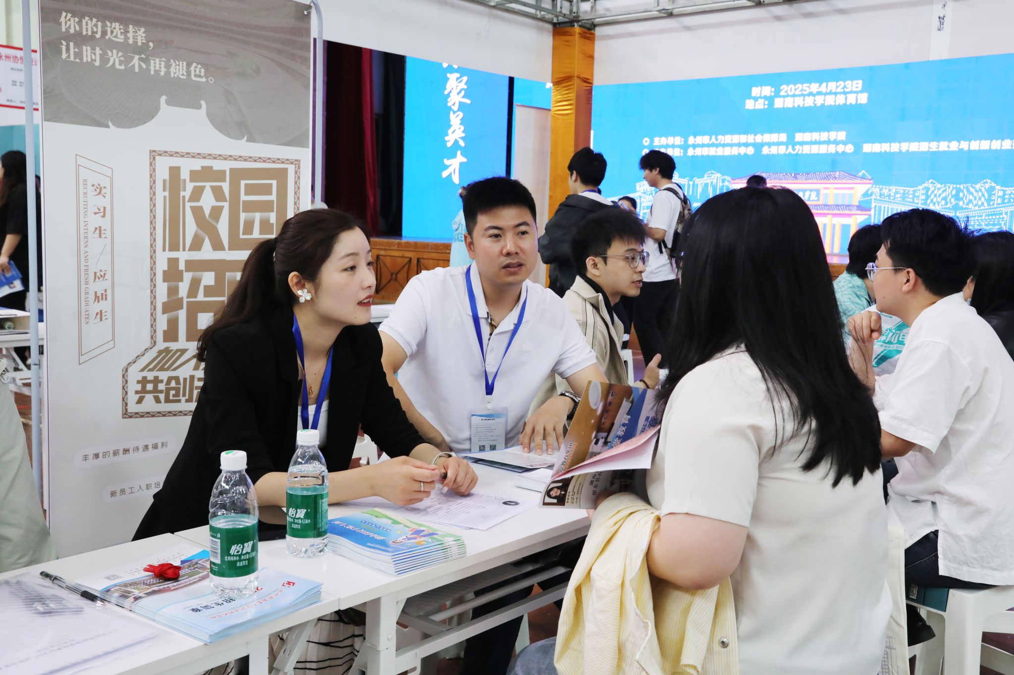 永州市税务局还通过政策宣讲、互动答疑、案例指导、有奖竞猜等形式吸引了众多企业代表和高校毕业生,以更精准的政策服务,聚焦用人单位和大学生就业创业需求。同时学校还联合“永州发布”“潇湘会”“永就业”等众多官方平台开启现场直播,同步进行线上推介,让无法到场的毕业生也能“云端”参会,实现线上线下互动互联,共同助力毕业生求职就业。
