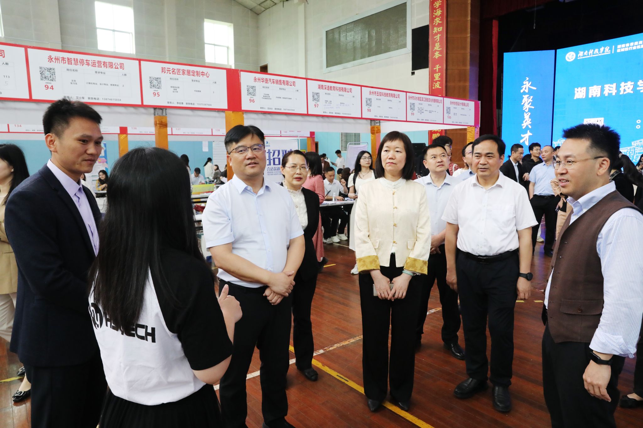 4月23日上午,学校举行2025年春季大型综合类双选会,校党委书记李钢,党委副书记、校长黄创霞,副校长郑银芳,永州市人力资源和社会保障局党组书记、局长、一级调研员骆方方,永州市人力资源和社会保障局副局长陈巍‌‌出席双选会。现场共有180余家企业参与,提供了涵盖教育、计算机、机械、生物等众多领域的4300余个就业岗位,为毕业生们提供了广阔的就业选择空间。
