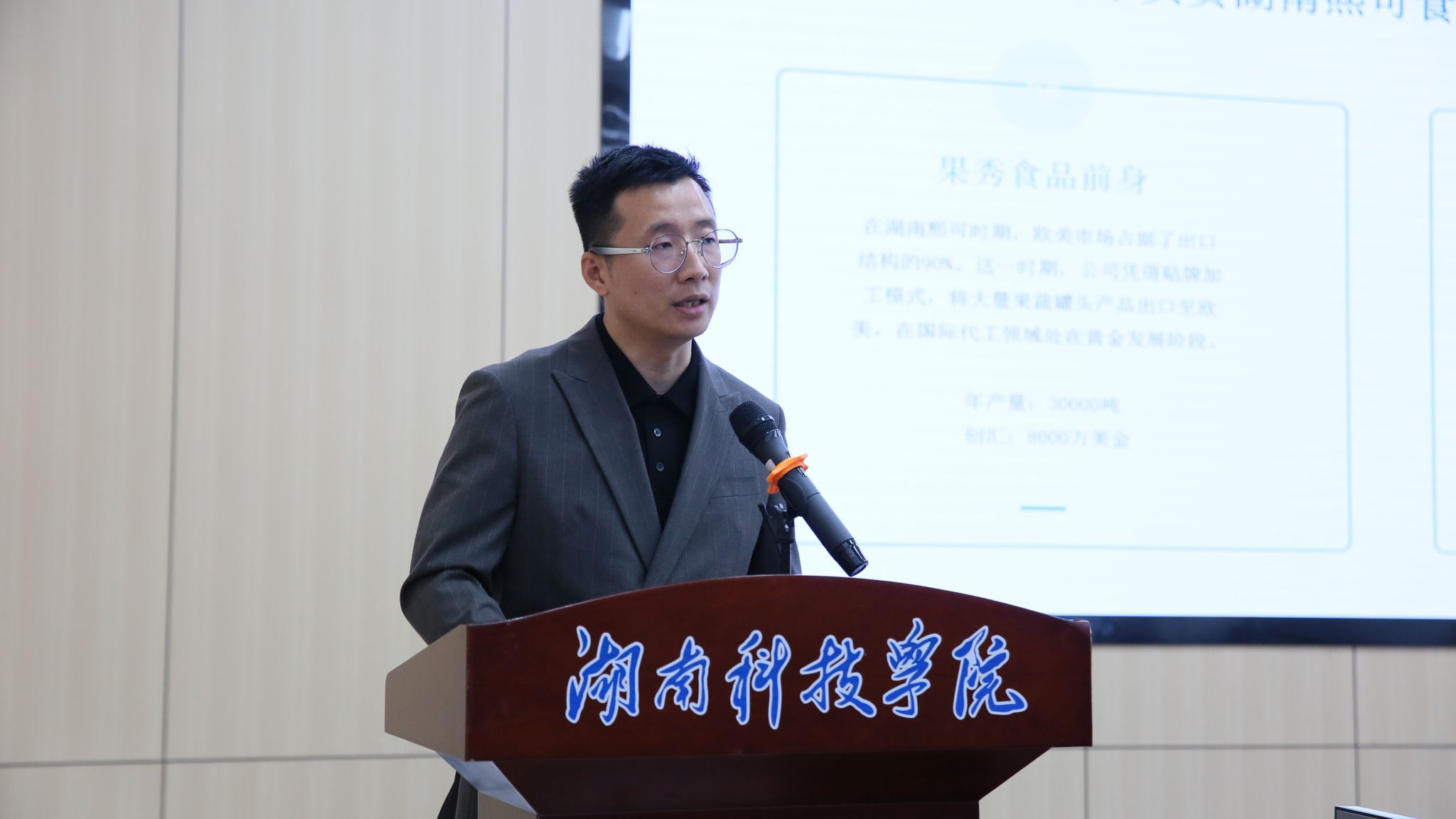 沈凡超分享了橘子罐头“突围战”,从贴牌到创牌的致富之路。湖南果秀食品有限公司始终立足永州本土特色,坚持“美味”和“健康”两大核心理念,打造多元化农产品罐头系列,助力永州特色农产品走向国际市场。他还鼓励在场学子要把握机遇。
